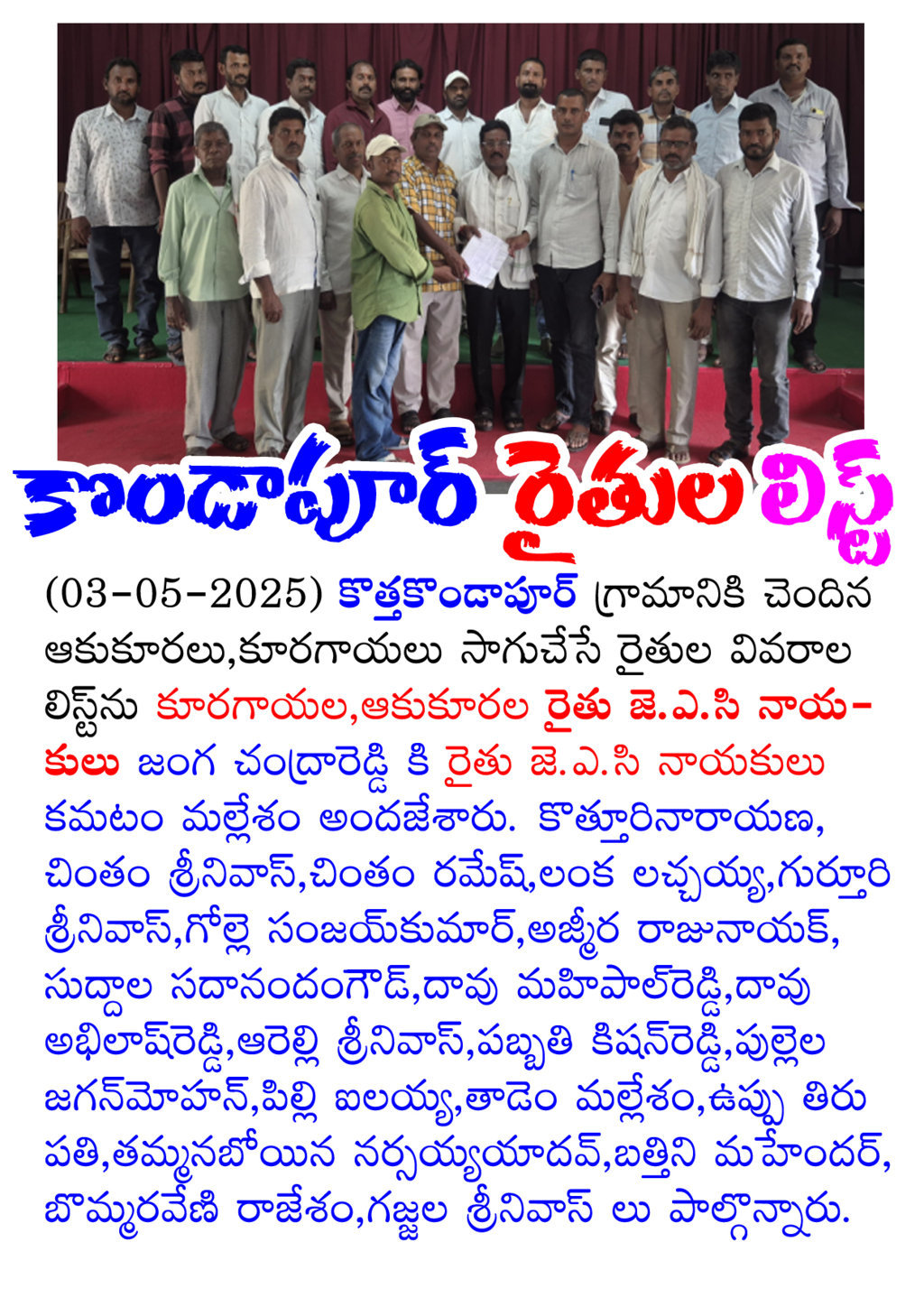 రైతుకుటుంబాలు అన్ని రైతులకే ఓట్లు వేస్తే రైతులు గెలిచి ప్రభుత్వాన్ని ఏర్పాటు చేస్తారు. రైతులు గెలిస్తేనే రైతుకుటుంబాలు బాగుపడతాయి. రైతులు అభివ్రుద్ధి చెందుతారు. |