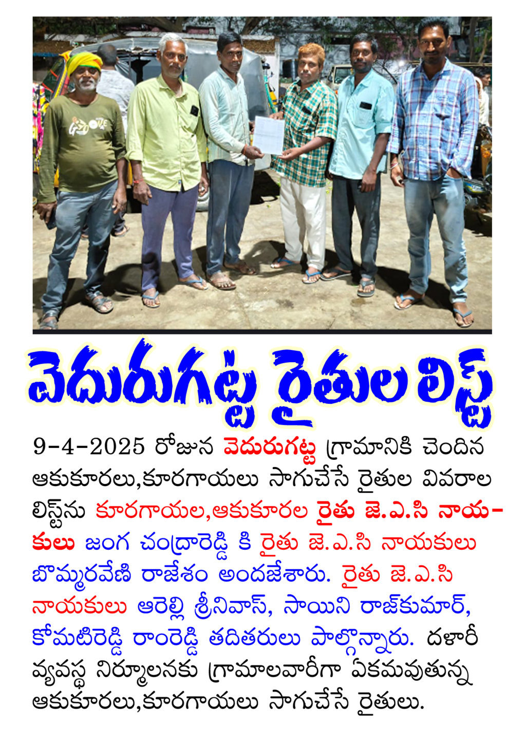 రైతుకుటుంబాలు అన్ని రైతులకే ఓట్లు వేస్తే రైతులు గెలిచి ప్రభుత్వాన్ని ఏర్పాటు చేస్తారు. రైతులు గెలిస్తేనే రైతుకుటుంబాలు బాగుపడతాయి. రైతులు అభివ్రుద్ధి చెందుతారు. |